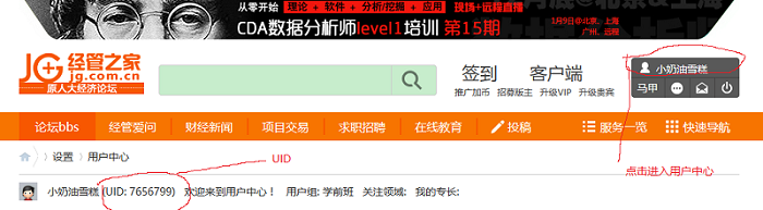 1.到人大经济论坛http://bbs.pinggu.org登录或注册后,点击右上角自己的用户名进入用户中心,标题栏第一行自己用户昵称的部分可以查询UID号码。然后按照本通知附件表格登记相关信息。